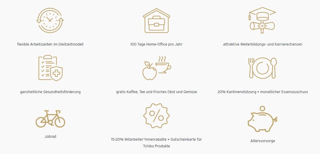 Bei Tchibo legen wir großen Wert auf das Wohl unserer Mitarbeiter*innen. Unsere umfassenden Benefits tragen dazu bei, dass du dich beruflich und persönlich entfalten kannst.