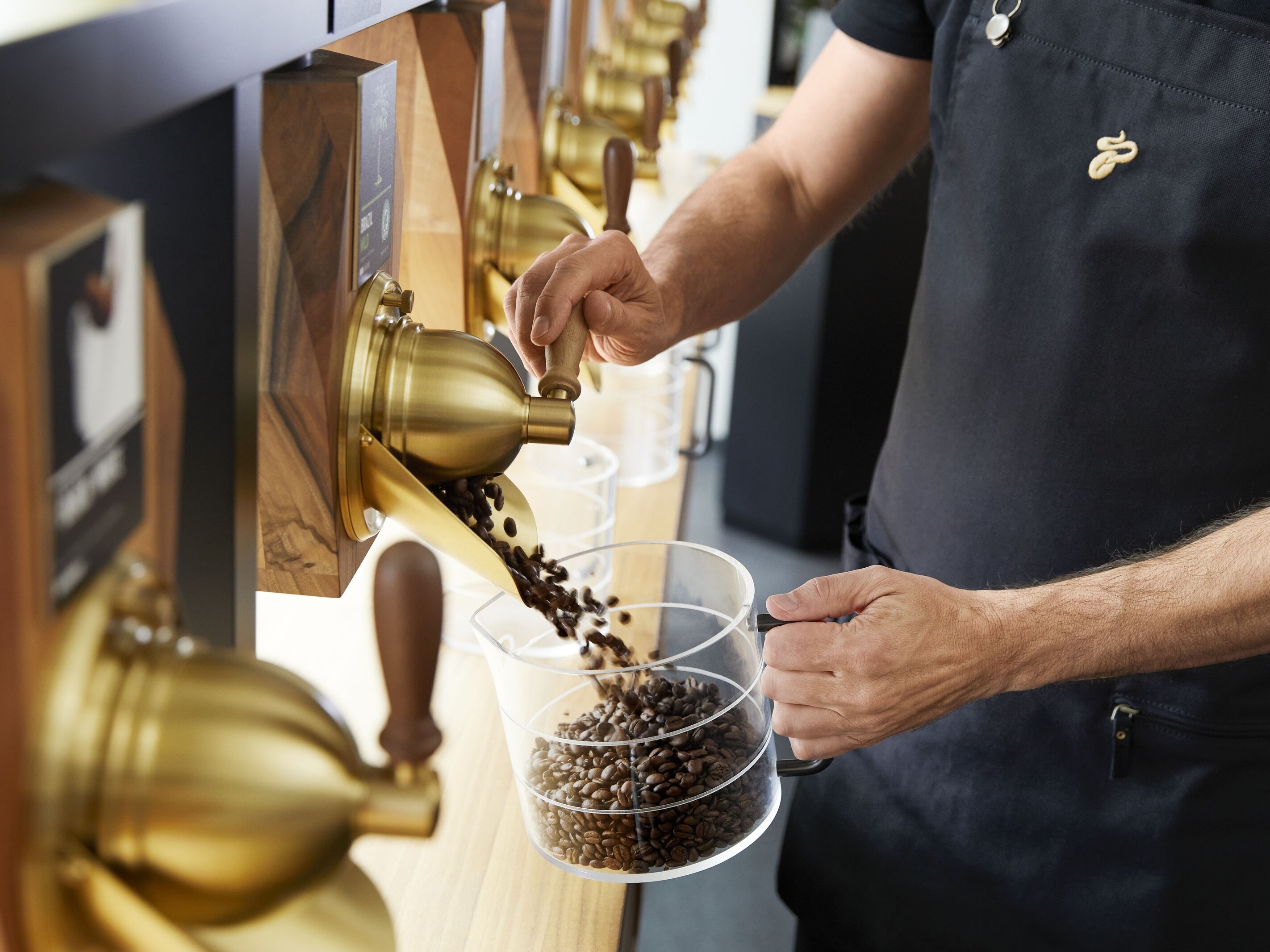 In unseren Tchibo Filialen können sich Kund*innen ihren Kaffee für unterwegs in nachhaltigere Mehrwegbecher füllen lassen – oder sie bringen ihren eigenen Kaffeebecher einfach mit. Gleiches gilt für den Kaffee für zu Hause - gemahlen oder in ganzen Bohnen: Einfach Aromadose mitbringen oder Dosen im Geschäft kaufen und in der Filiale befüllen lassen. Die Mitarbeiter*innen füllen die gewünschte Menge dann direkt aus dem Schacht neben der Theke ab. Kund*innen haben die Wahl zwischen über acht verschiedenen Kaffeesorten, die als lose Ware, als ganze Bohnen oder mit individuellem Mahlgrad erhältlich sind – ohne Kompromisse bei der Qualität.