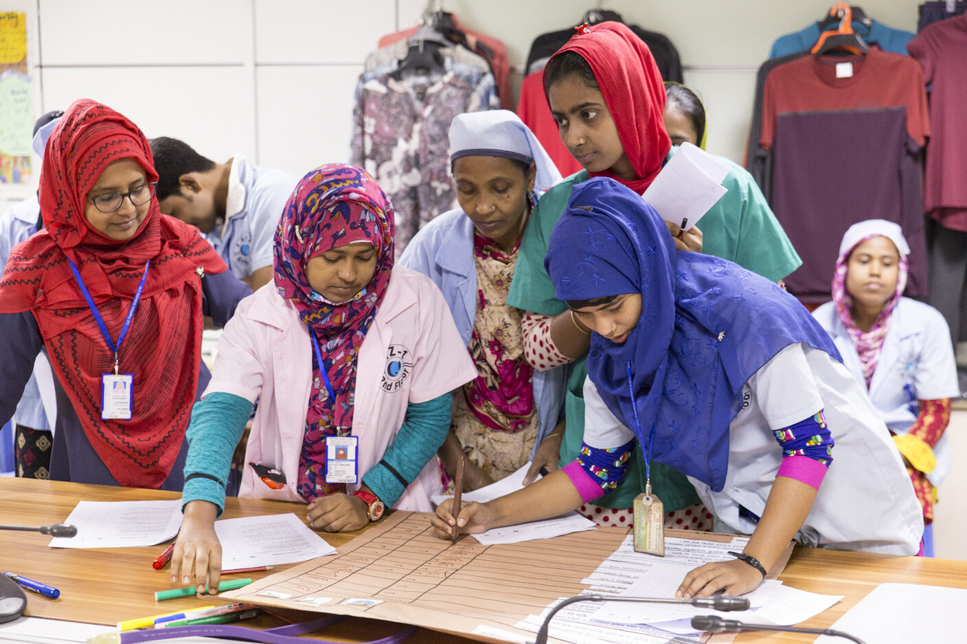 Das WE Programm läuft nicht nach einem festen Muster ab. Es entsteht in jeder Fabrik neu, je nachdem welche Probleme sie hat oder welche spezifisch für ihren Sektor sind. Sobald WE in einer Fabrik startet, definieren die Teilnehmer*innen die Probleme, die für sie gerade am dringlichsten sind. Sie legen so die Reihenfolge fest, in der sie die Menschenrechtsbereiche bearbeiten wollen. Wir stellen sicher, dass immer Arbeiter*innen und deren Vertreter*innen sowie Fabrikmanager*innen gemeinsam an WE teilnehmen.