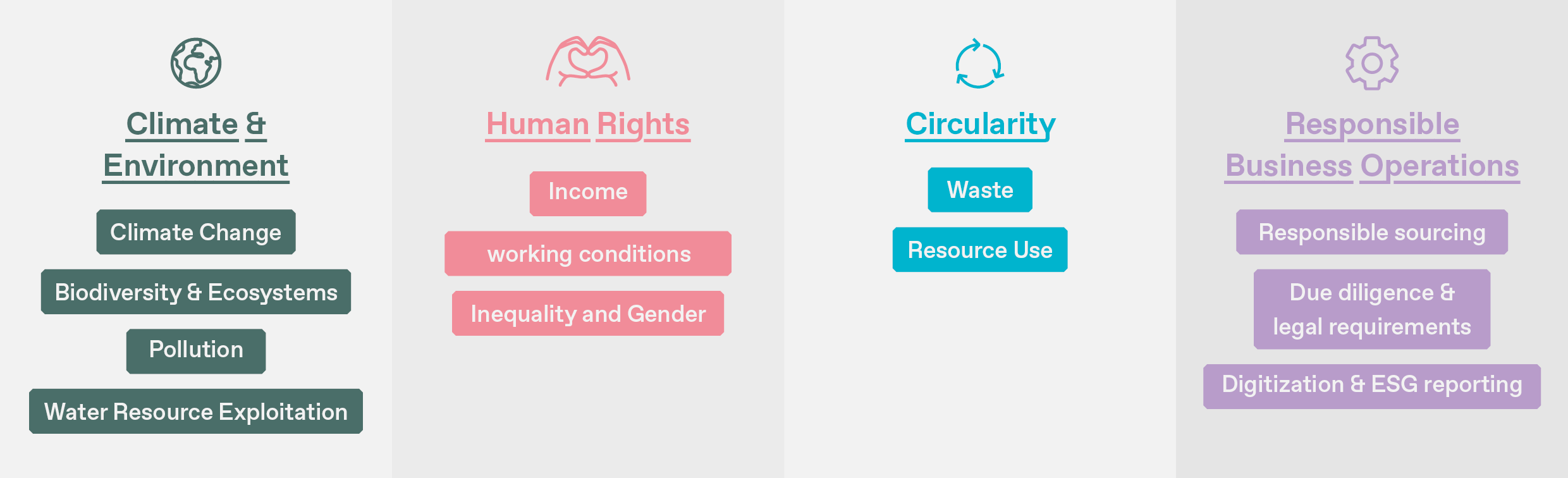 Innerhalb der Handlungsfelder fokussieren uns auf die Themen, bei denen wir die größten Risken, Wirkungen und Chancen in unseren Lieferketten und Sortimenten haben: