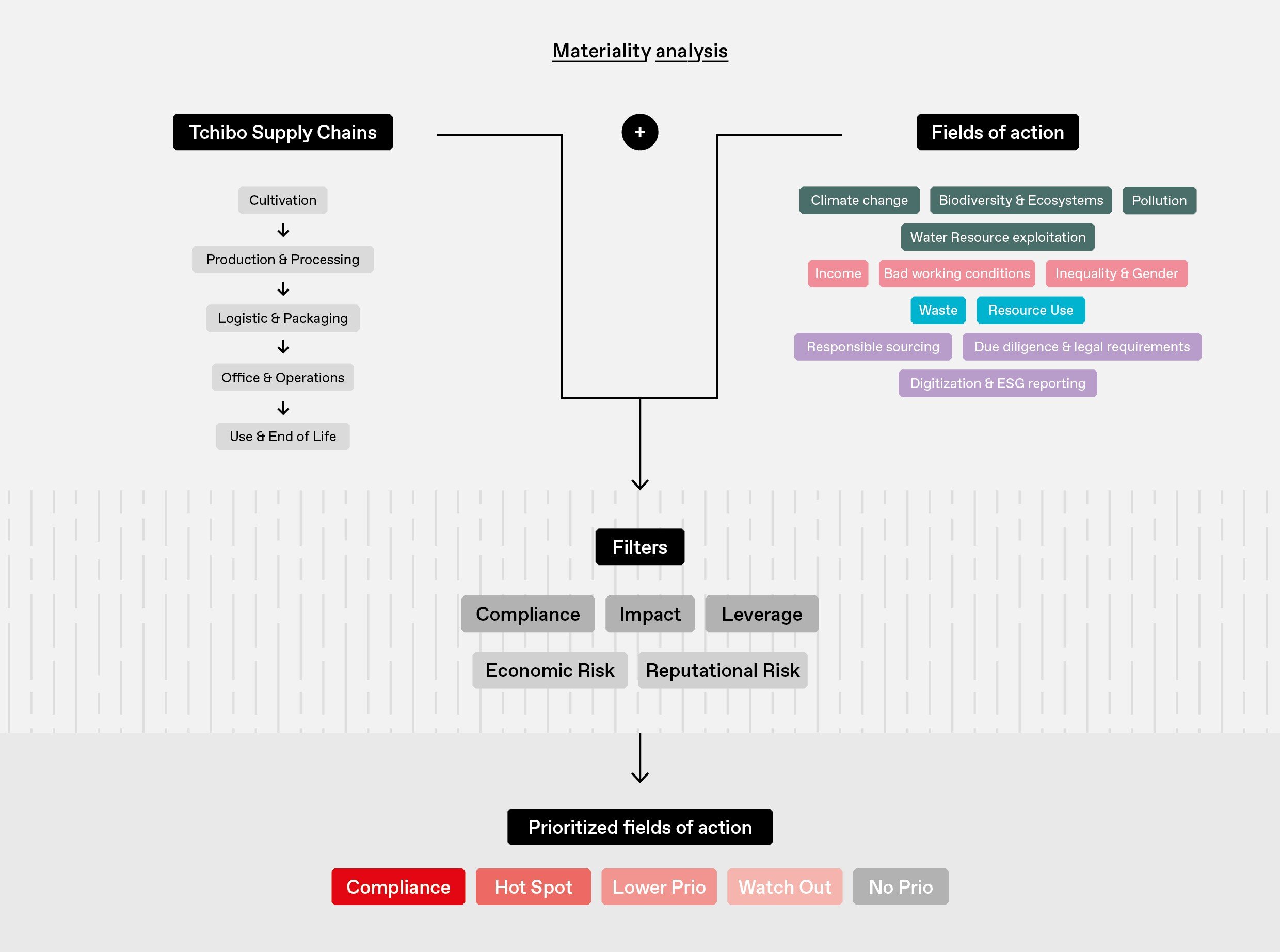 Seit 2012 überprüfen und erweitern wir unsere Lieferkettenstrategiematrix, auf der wir unseren Handlungsfelder und Themen nach Wesentlichkeit verorten. 2024 haben wir die Wesentlichkeitsanalyse nach CSRD-Kriterien neu ausgerichtet und sind aktuell dabei unsere Strategie dahingehend zu überprüfen und weiterzuentwickeln.
