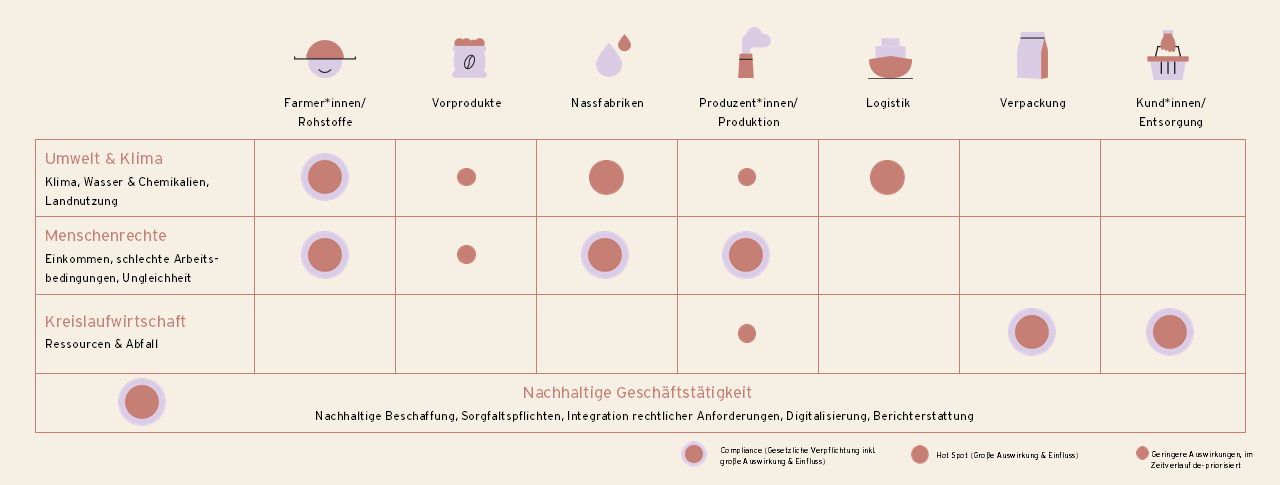 Ausgangspunkt unserer Strategie sind unsere Wesentlichkeits- und Risikoanalysen: Wir analysieren laufend unsere Wertschöpfungsketten, identifizieren Chancen, Risiken und Hotspots. Dabei beziehen wir wichtige Stakeholder wie beispielsweise die Menschen in unseren Lieferketten, Partner*innen, Mitarbeiter*innen, NGO's und Kund*innen aktiv mit ein. Ein weiteres, zentrales Instrument ist unser Issues-Management, mit dem wir gesellschaftliche Entwicklungen frühzeitig erkennen und strategisch bewerten – um Risiken zu minimieren und Chancen für nachhaltige Marktentwicklung zu nutzen.