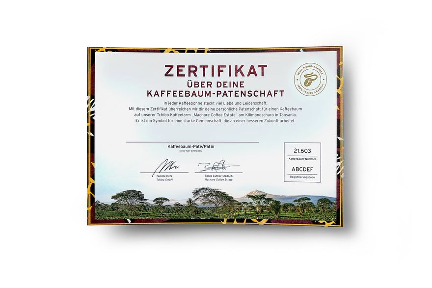 So viel Gutes muss belohnt werden: Unter allen registrierten Paten verlost Tchibo 2 x 2 Reisen nach Tansania zur Kaffeefarm inklusive einer Safari (Für die Teilnahme am Gewinnspiel müssen sich Zertifikate-Inhaber einmal online registrieren). Die Übernahme einer Kaffeebaum-Patenschaft ist ab sofort bis Dezember 2025 möglich. Und zum Preis von ca. 80 Euro online bei Tchibo erhältlich.