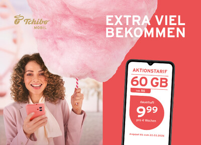 Tchibo MOBIL bietet ab dem 23. Februar einen neuen Aktionstarif an: Bis zum 22. März 2026 sind bei dem Hamburger Mobilfunkpionier 60 GB Datenvolumen zum Dauerpreis von 9,99 Euro pro vier Wochen erhältlich. Anders als bei zeitlich befristeten Einführungspreisen bleibt dieser Preis nach Tarifaktivierung dauerhaft bestehen. Das Angebot richtet sich sowohl an Neukunden als auch an Bestandskunden, die kostenlos in den Aktionstarif wechseln können.