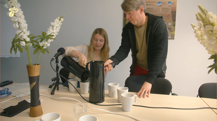Monika Heyn [00:11:23] So, dann gieße ich jetzt schon mal die ersten Tassen ein. So, jetzt kommt der andere Kaffee. Jetzt müssen wir einmal schauen, dass wir nicht durcheinander kommen. Das ist die linke Tasse. Jetzt gieße ich die rechte Tasse ein. So, dann befindet sich hier die linke Tasse einmal, Karina und Ralf. - Das ist das rechte Pendant.