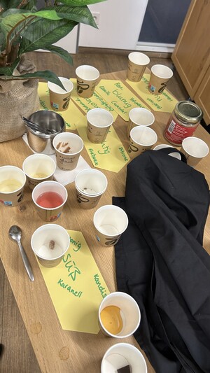 Anhand von interaktiven Stationen konnten wir unsere Sinne auf die Probe stellen. Eine Station forderte uns auf, verschiedene Gerüche aus kleinen Döschen wahrzunehmen und zu identifizieren. Es stellte sich heraus, dass es gar nicht so einfach war, den Namen des Geruchs zu benennen, obwohl wir ihn auf der Zunge hatten. Dies liegt daran, dass das Sprachsystem und das Geruchssystem im Gehirn weit voneinander entfernt sind. Die Kunst besteht darin, diese beiden Systeme miteinander zu verknüpfen und die richtigen Worte für die wahrgenommenen Gerüche zu finden. Eine andere spannende Übung forderte uns auf, mit geschlossenen Augen verschiedene Lebensmittel zu probieren und diese dann den Kategorien des Aromarads zuzuordnen. Von einem Stück Schokolade über einen Erdbeersaft bis hin zu Thymian war alles dabei. Oft mussten wir länger überlegen, um herauszufinden, welches Aroma wir gerade schmeckten. Diese Übung verdeutlichte uns, wie vielfältig und komplex die Geschmacksprofile von Lebensmitteln sein können.