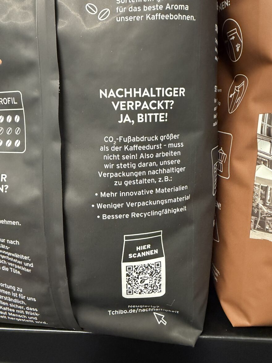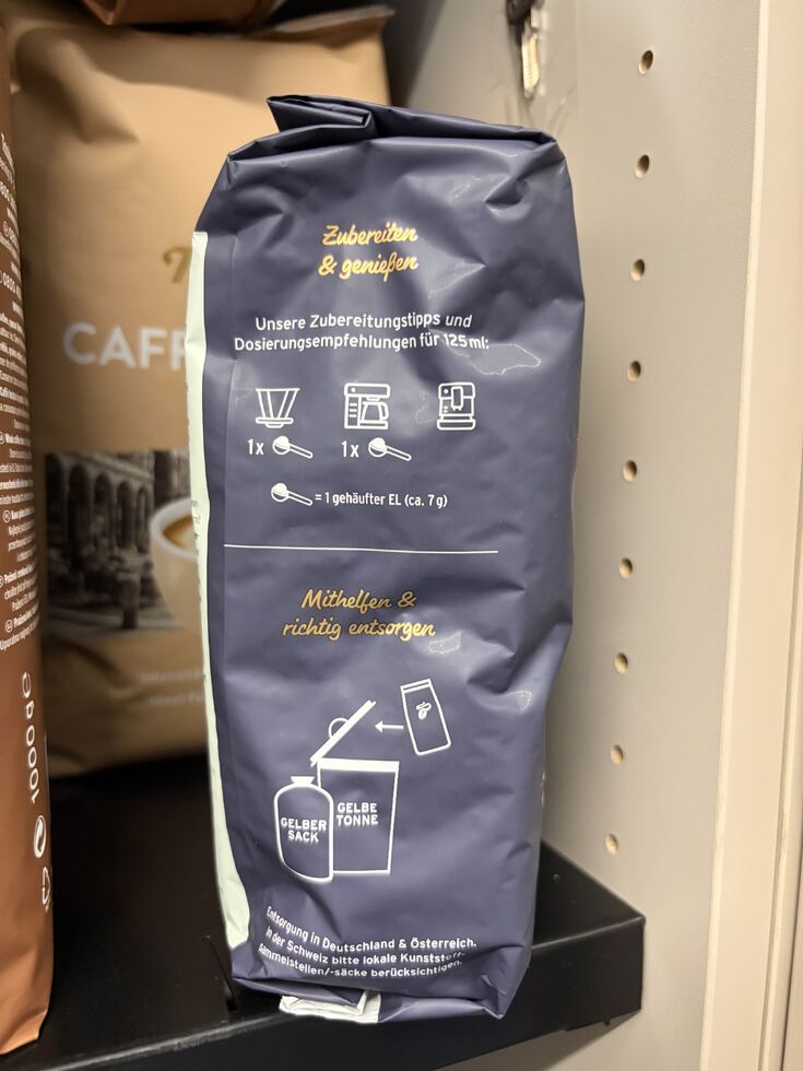 · Schaut euch die Kennzeichnungen, Trennhinweise auf den Packungen an. Entsorgt z.B. unsere Kaffeeverpackungen in der Gelben Tonne/im Gelben Sack